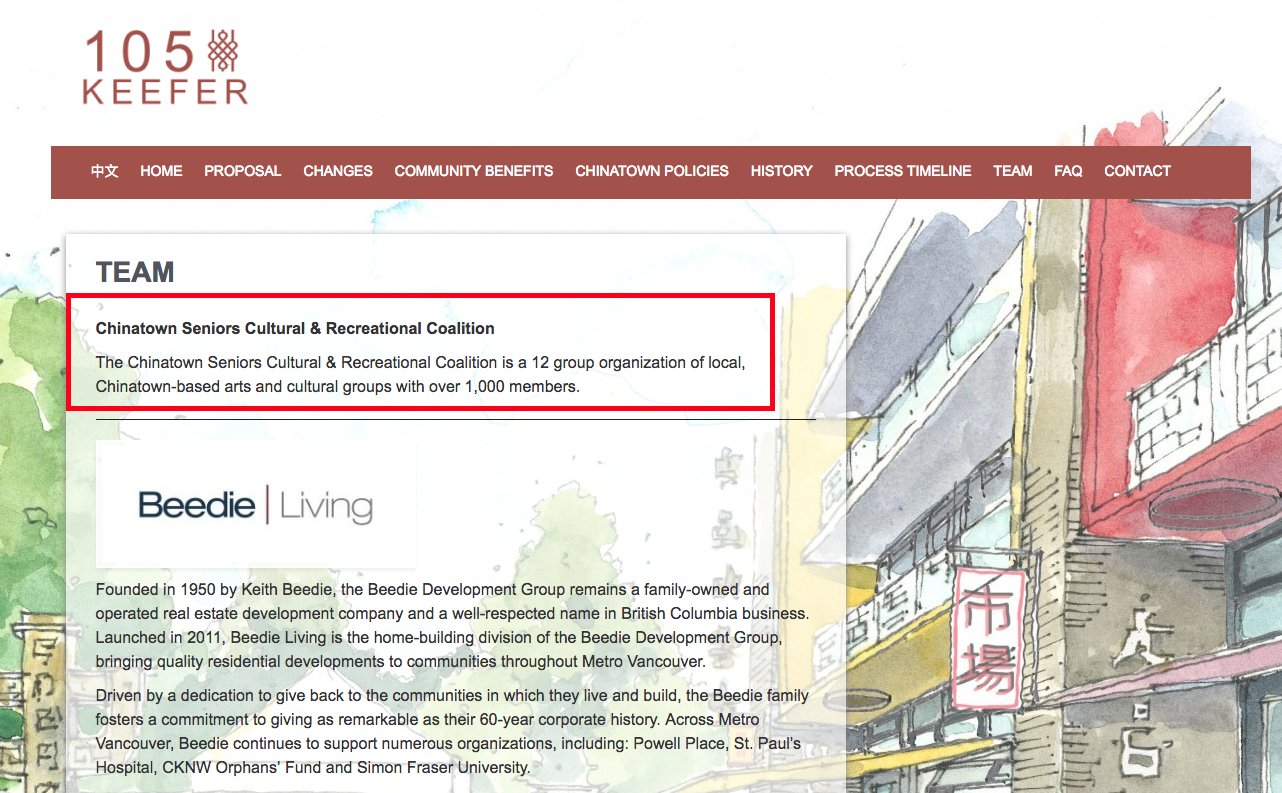 - Councillor Stevenson claimed that “younger people were not respectful to their elders.” Throughout the public hearing, Councillor Stevenson questioned repeatedly whether youth were against seniors. The narrative of “youth against seniors,” which was also put forward by several pro-105 Keefer speakers, is absolutely untrue. Views of and visions for Chinatown are not determined by age. We stand in solidarity with the seniors of Chinatown. Every day, many young people work directly with seniors who live in Chinatown. They accompany them to medical appointments, provide English-language translation to meet their daily needs, serve on committees together, and ensure that they are able to engage authentically with the City of Vancouver’s civic process. Youth who accompanied seniors to the public hearing did not speak for them. They enabled elders to speak for themselves, as individuals with opinions and agency. The false narrative that pits youth against seniors renders the healthy intergenerational relationships in Chinatown invisible.